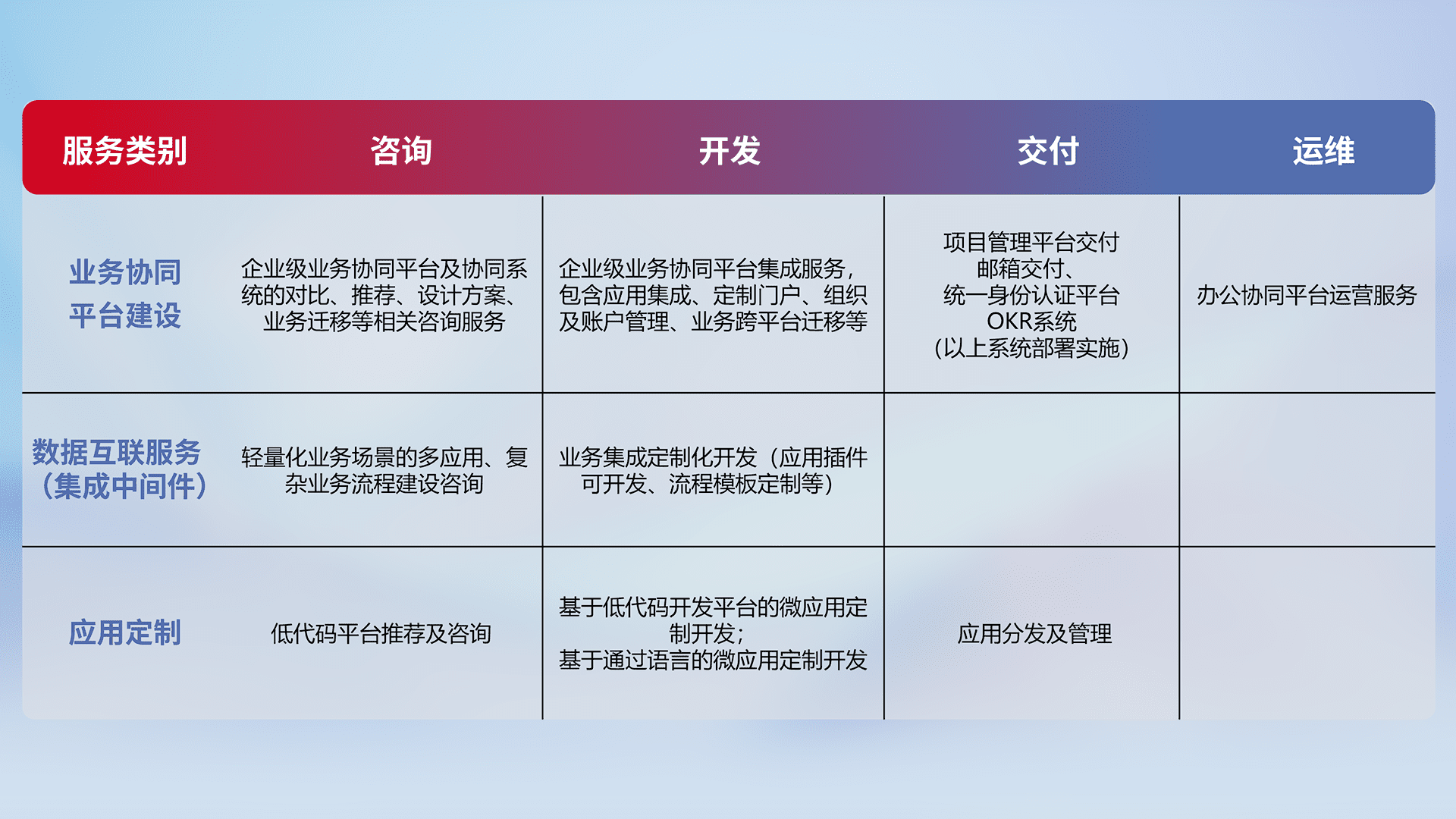 针对钉钉、、、、企微、、、IDaas等平台级产品提供产品的规划、、方案、、交付、、、定制化开发等服务,,,实现如统一协同办公、、、智能客户服务、、、混合会议管理、、智能数据查询、、等业务场景,,实现数字化转型。。
